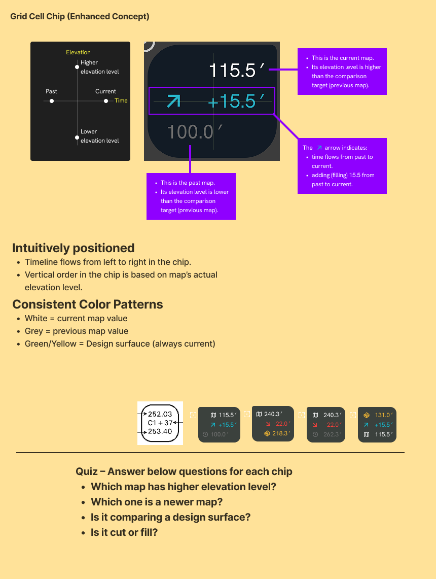Survey and construction teams found it difficult to quantify precise cut/fill changes using only color gradients, leading to time-consuming workarounds and loss to competitors offering numeric grid visuals.